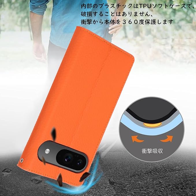 Havaya 対応 Pixel9 pro ケース Pixel9 ケース ピクセル9 ケース 手帳型 本革 ストラップ Google グーグル スマホケース docomo au 耐衝撃 カバー SoftBank カード収納 スタンド機能 レザー -オレンジ
