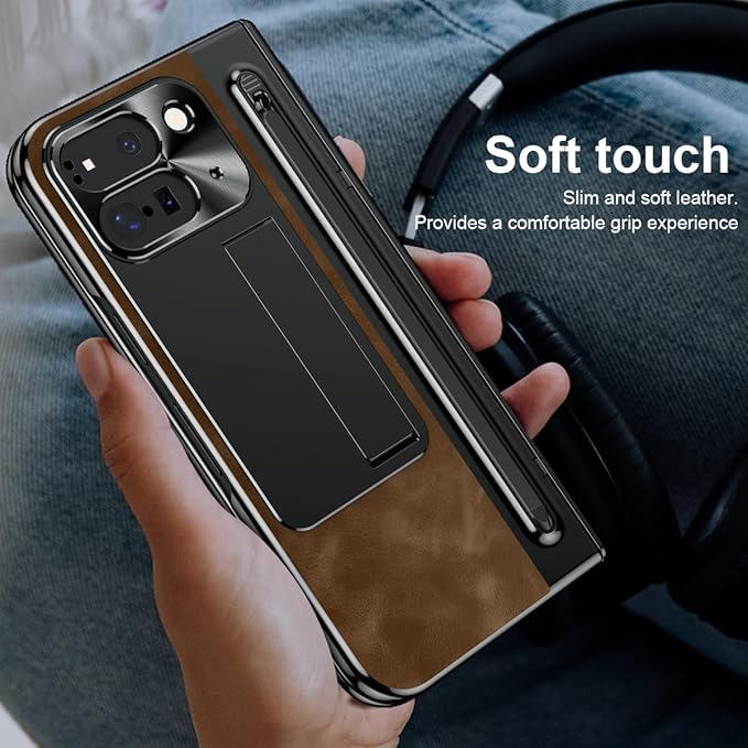ケース GG Pxl 9 Pro Fold用 手帳型 つや消し皮革 隠しブラケット機能 ヒンジ保護 ペンみぞ メタルレンズカバー 薄型 軽量 古典なレザー 折り畳み 人気、キラキラ おしゃれ かわいい 二層構造 取り外し ポケット 耐衝撃 QI充電 ワイヤレス 財布型 面白い - コーヒー色