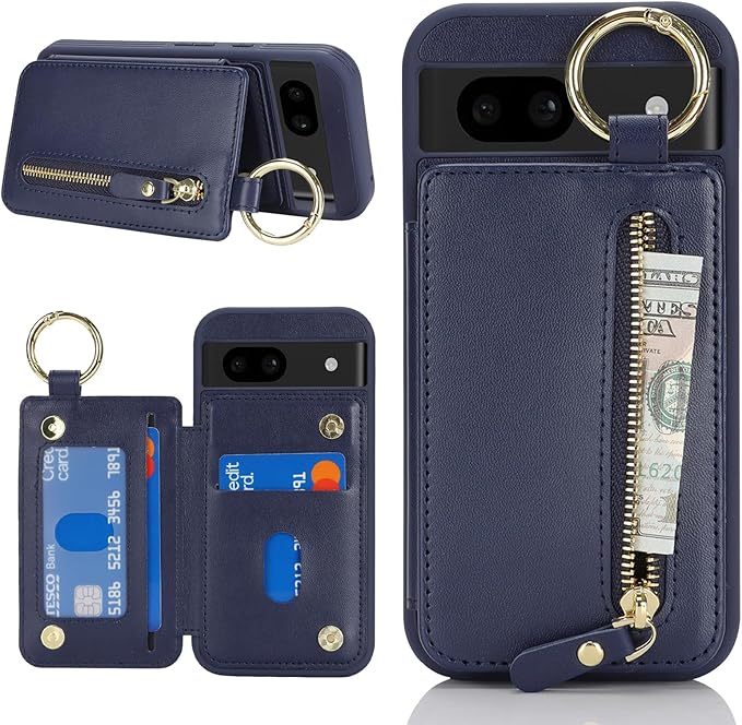 Havaya 対応 Pixel 8a ケース Google Pixel 8a ケース カード収納 米軍MIL規格 リング付き キーホルダー キーリング ピクセル8a 耐衝撃 au docomo スタンド機能 SoftBank 財布 フェイクレザー-ブルー
