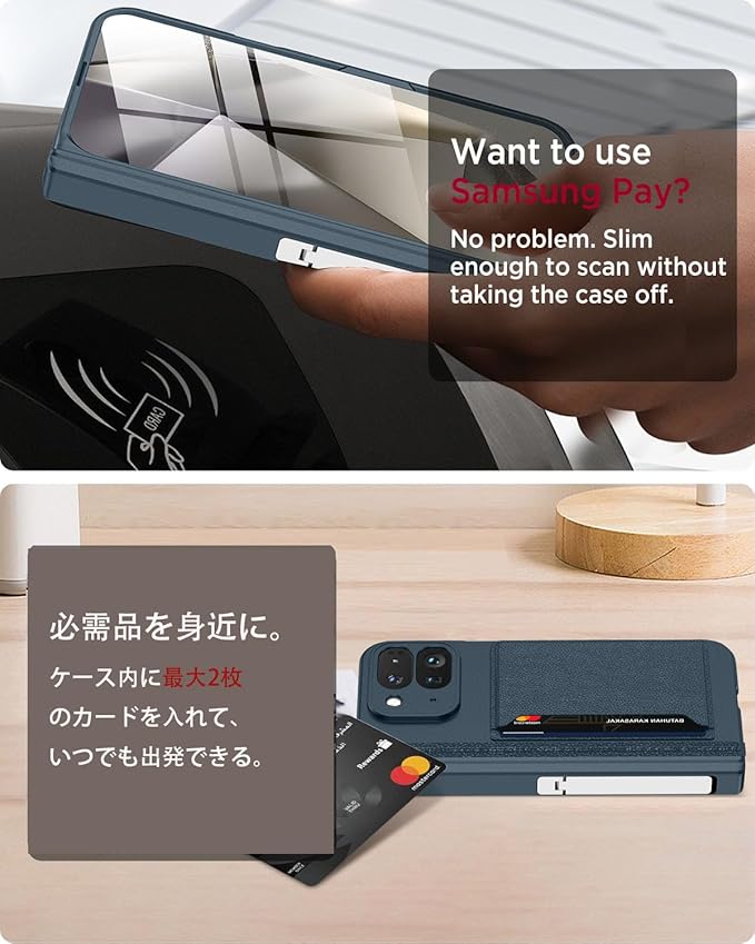 【カード収納&スタンド機能】❶2 つのカードスロットがあり、精密な切り口によりカードを安全に保管できます。ショップでのポイントカード、交通機関でのスムーズな移動をサポートでき、ちょっととしたお出かけてもこれで十分です。❷機能性 横置きスタンド機能が付いて、好きな角度で動画鑑賞や読書などを楽しめます。耐久性テスト1000回を経た金属製ブラケット。あなたの手を解放してくれます。