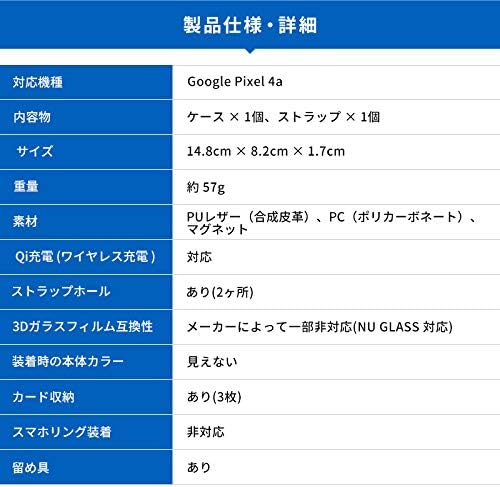 【製品仕様】… ◆ 機種 : Google Pixel 4a ( グーグル ピクセル 4a ) ◆ 内容物 : ケース 1個、ストラップ 1個 ◆ サイズ : 約 14.8cm 8.2cm 1.7cm ◆ 重量 : 約 57g ◆ 素材 : PUレザー(合成皮革)、PC(ポリカーボネート)、マグネット ◆ 製品型番 : CR_P4ACSPLNL_RB