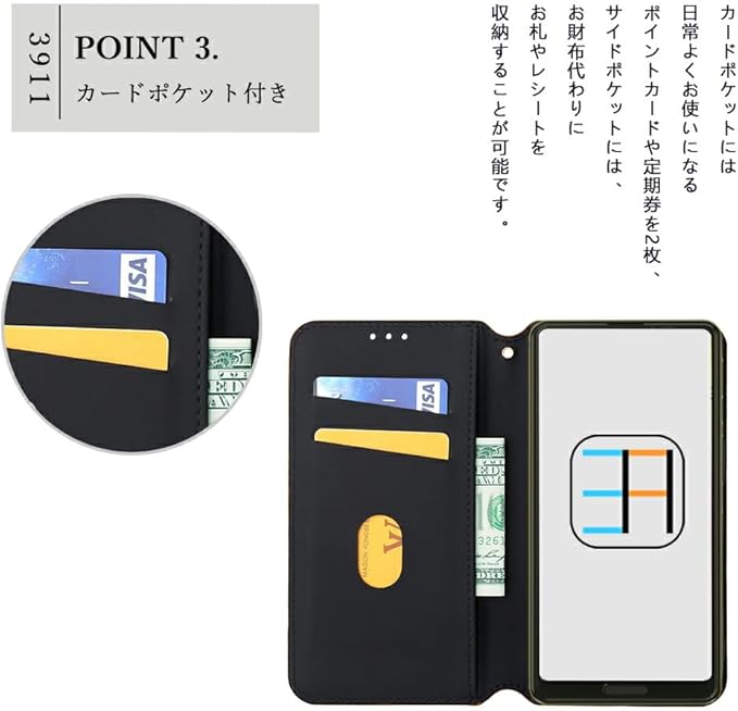 手帳内:カードポケット 2 カ所/サイドポケット1カ所/ストラップホール1カ所