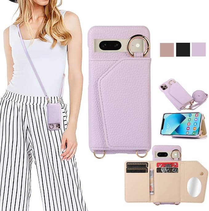 Google Pixel7 ケース ショルダー ストラップ FASY グーグル ピクセル7 カバー Google Pixel 7 スマホケース ショルダー タイプ ミラー 鏡付き グーグル ピクセル 7 スマホストラップ 肩掛け 背面手帳型 かわいい おしゃれ 革 耐衝撃 ショルダー GooglePixel7 スマホ 携帯 ケース ショルダー 斜め掛け リング付き 首掛け ストラップ ラベンダー