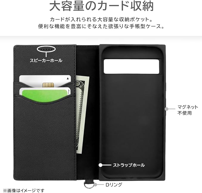 ケースの蓋を閉じたまま通話が可能。動画視聴などに便利なスタンド機能付き。ストラップホール Dリング付き。カードが入れられる大容量な収納ポケット。