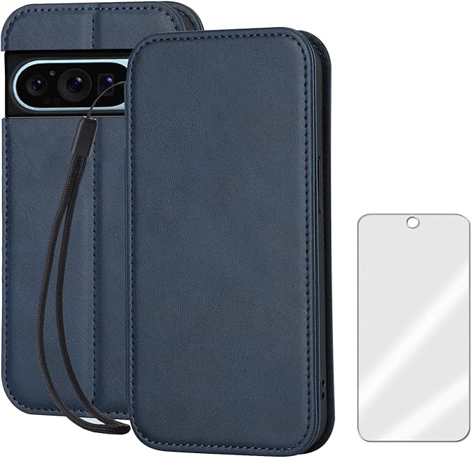 ケース 適用 Pixel 9 / 9 Pro 手帳型 ピクセル9 9プロ レザーケースカード収納 内蔵マグネット式(携帯ストラップ付き、ガラスフィルム付き)レトロネイビー