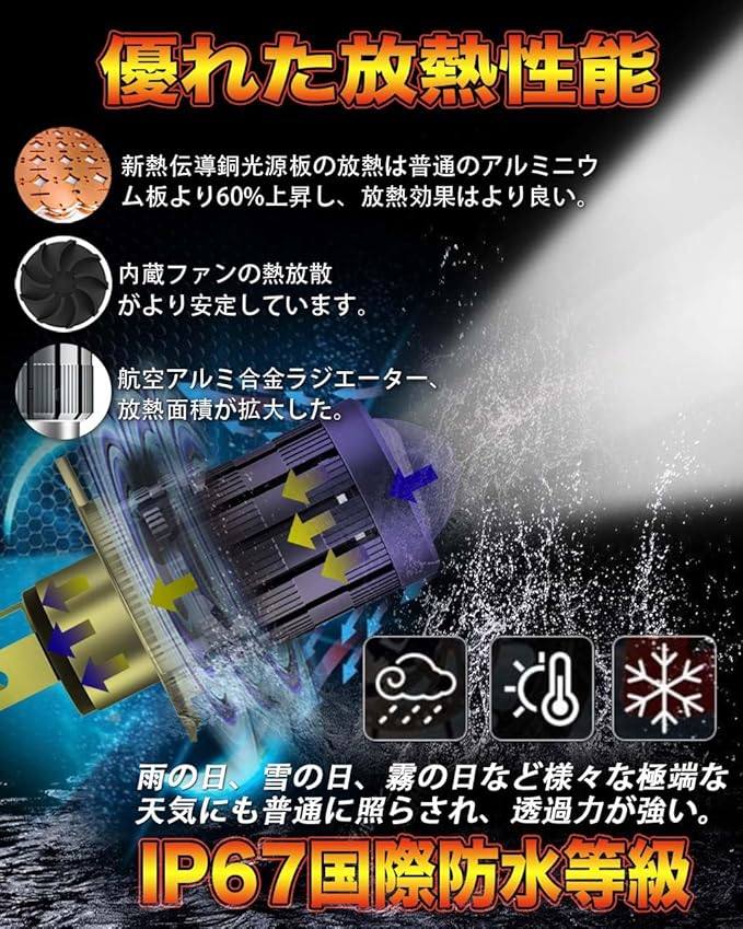 【効率的な放熱性能と防水の原理】ファンのないランプでも放熱効果が得られるのはなぜでしょうか?①原理は銅ベースと6063航空アルミ放熱の組み合わせを採用して、これで放熱の目的を達成することにあります。②瞬時熱伝導&短時間排熱により、効率的に熱を放散し、製品の寿命を延ばすことができます。③IP67防水レベルを使用し、効果的に防水を達成する機能。さまざまな環境に対応できる。バルブの性能を確保することができ、耐久性が長くなる。