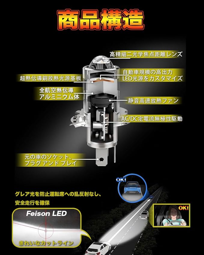 【集光レンズの役割】①新型プロジェクター H4 LEDヘッドライトバイク用。②拡大鏡のように光を集めることができ、こうしたヘッドライトはより遠くまで照らすことができる。③ライトの照射角度を制限することができます。さもなければ、ライトがあちこちに発散して、他の車の所有者や歩行者に影響を及ぼすことができます。