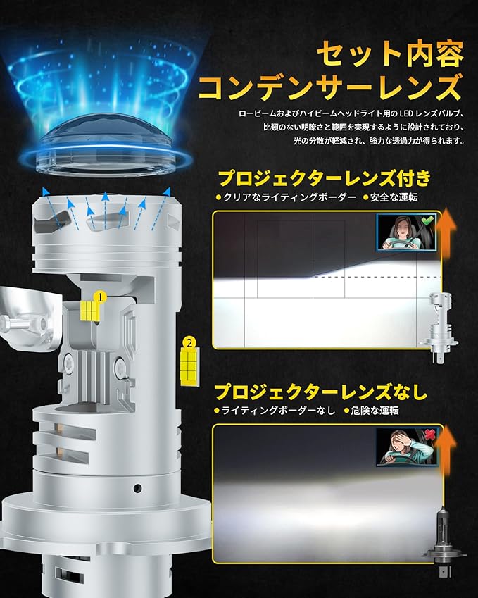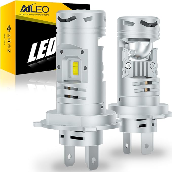 【迅速な熱放散】H4プロジェクションLEDヘッドライトは航空機用アルミニウム製ボディとユニークな中空ヒートシンクを採用し、熱放散効率を250%向上させ、バルブが50,000時間以上連続して光を放つことを保証します。最新のH4ミニプロジェクションレンズ付きLEDヘッドライトは、元のハロゲンサイズに完全に適合し、簡単に取り付けることができます。