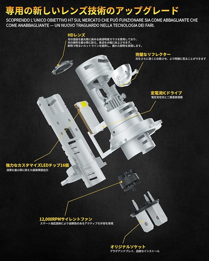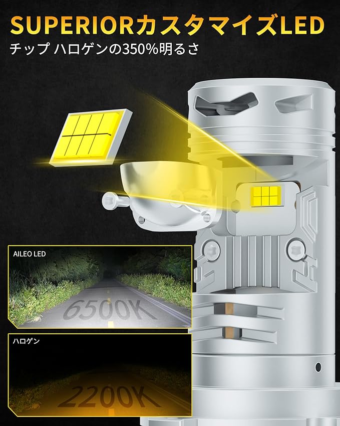 モデル: AILEO H4 LEDバルブ光束: 8000LM/バルブ、16000LM/ペア動作電圧: DC 9-32V(12V、24V車両に対応)色温度: ホワイト 6000K防水・防塵等級: IP68素材: 航空機用アルミニウム6063動作温度範囲: -40 C ~ +150 C寿命: 50000時間