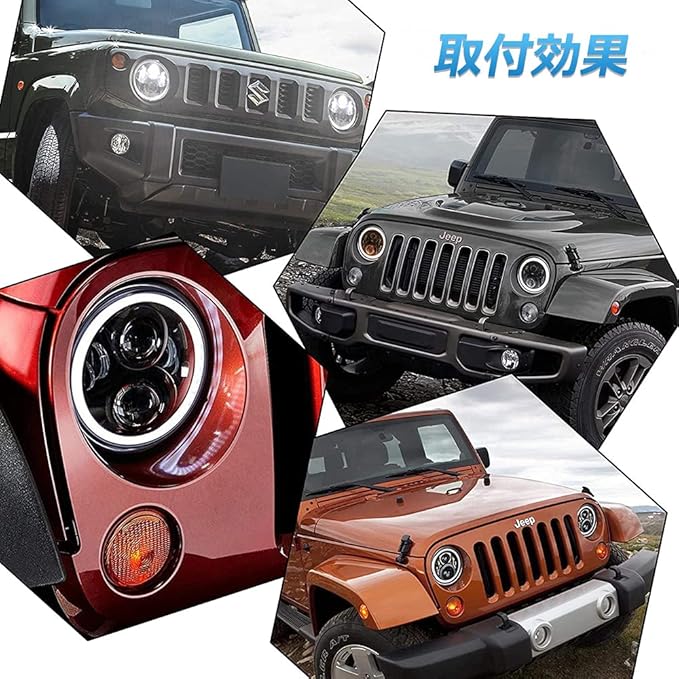 【適用車種】ジープラングラー、ジムニーなどの7インチヘッドライト装着車に適用します。ジープラングラーJK 2ドア(2007-2015)、ジープラングラーJK アンリミテッド4ドア (2007-2015)、ジープラングラーTJ/ LJ アンリミテッド (2003-2006)、ジープラングラーTJ (1997-2006)、ジムニーJA系、ハマー H1&H2(2003-2009)などなどに適用します。ご購入する前に、車種と型式を確認してください。