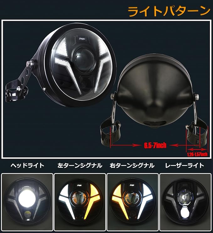 7インチLED オートバイヘッドライト 超遠補助スポットライト ホワイトDRL アンバーターンシグナル ヘッドライトハウジングバケットマウントブラケット付き バルカンカスタム CB400 CB1300 XS650 チョッパーカフェレーサーボッベに対応