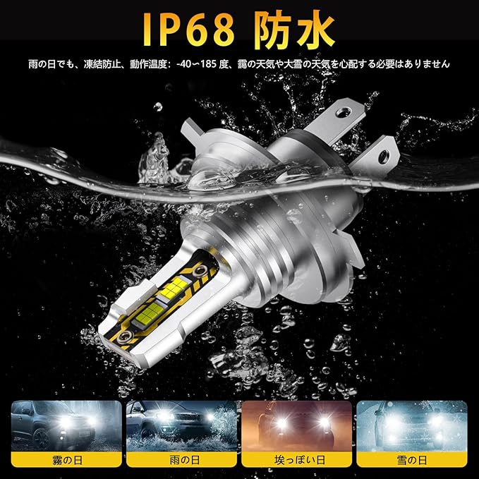 主な仕様 消費電力: 1セット60W(1本30W)、強力な照射を実現。全光束: 1セット16000LM(1本8000LM)、ハロゲン電球より500%明るい。モデル詳細: H4/HB2/9003 LED ヘッドライト バルブ。色温度: 6500K クールホワイト、昼光色に近く視認性を向上。材質: 航空機用アルミニウムボディで高耐久性と長寿命を実現。防水・防塵: IP68 等級で全天候に対応。動作電圧: DC9~18V、12V車両システムに適合。動作温度範囲: -40℃~+185℃、極端な環境下でも安定稼働。寿命: 50,000時間以上使用可能、交換頻度を大幅削減。特長優れた視認性: 高性能CSPチップ24個搭載、1:1理想ビーム設計で乱反射や眩惑を防止。必要な場所だけを明るく照らし、バイクや車のハイビーム用にも最適。高効率放熱: ダブル銅基板+ファンレス1:1設計+アルミニウムボディにより、効率的に放熱。長時間走行でも安定性能を維持。簡単取付: プラグアンドプレイで約5分、加工不要。h4 led 車検対応 の代替としても人気。高い互換性: 内蔵インテリジェントICドライバーで99%の車両に対応。バイクledヘッドライト h4、ライジング2 交換にも最適。