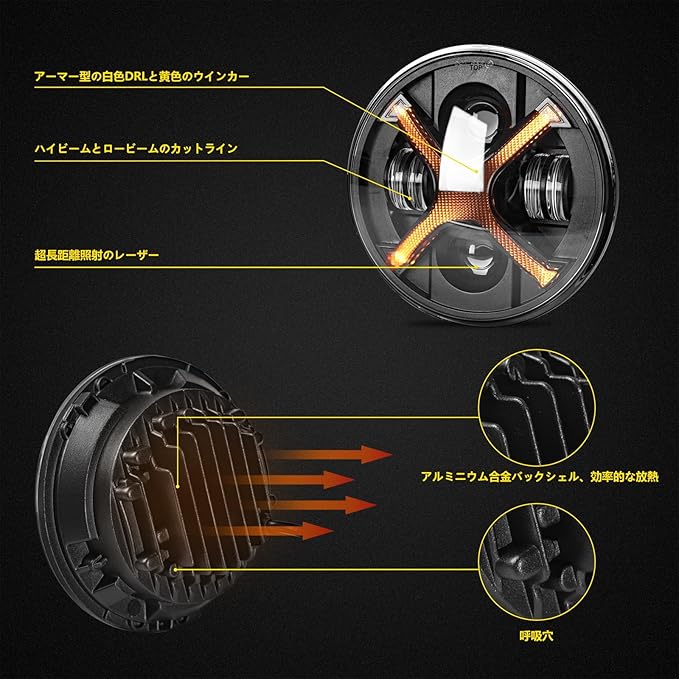 【多機能ヘッドライト】7 インチ LED ヘッドライト X 字型DRL フロントターンシグナルライト付き 。★ハイビーム:6000LM ★ロービーム:4800LM ★6000KホワイトDRL ★イエロー ウインカーンシグナルライト。X 字型 を備えた最新の素晴らしいデザインの LED ヘッドライトは、あらゆる状況でお客様の要件を満たします。 ハロゲンおよびHIDヘッドライトの完璧な代替品です。