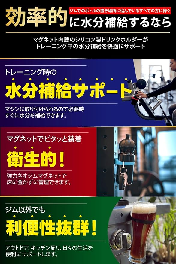 【 強力ネオジム磁石がしっかりホールド 】耐荷重は圧倒的な約2kg。マグネットがジムマシンやベンチプレス台、インクラインベンチに強力にくっつきマイボトルをしっかり固定。大きいボトルの置き場所にもう困りません。