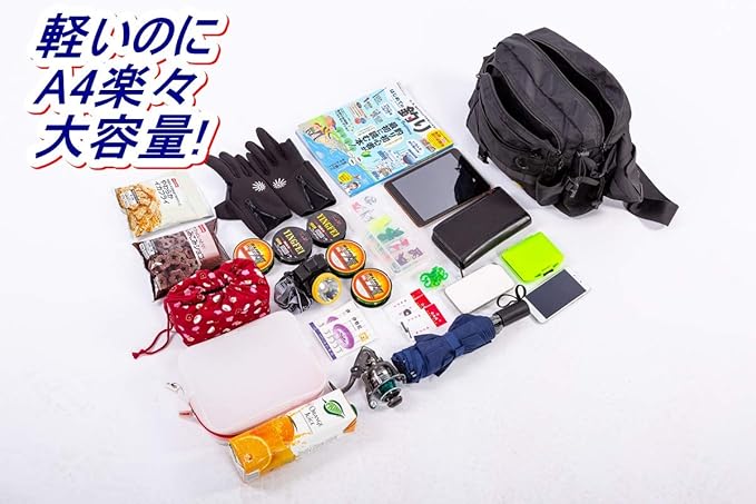 サイズと重量:幅30㎝x奥行12㎝x高さ29㎝ / 本体重量:約460g 肩パッドを追加し、クッションパッドは維持しつつも軽量素材の採用で軽量化! ドリンクホルダーには、1リットルの紙パックも入るのが嬉しい! スマホ、お弁当、仕掛けからA4サイズの雑誌なども全てスムーズに入るのも嬉しい!