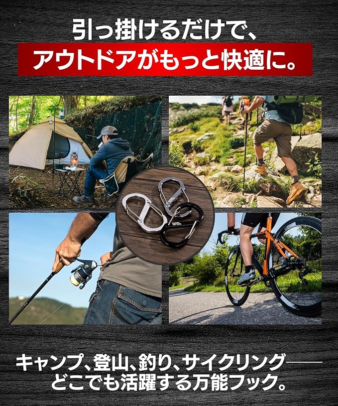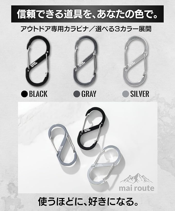 【軽量設計で日常にも最適】1個あたりわずか8.5gという軽さで、持ち歩きやすく日常のバッグや鍵、ベルトにも自然にフィット。アウトドアシーンだけでなく、通勤や通学時の小物整理にも活躍します。