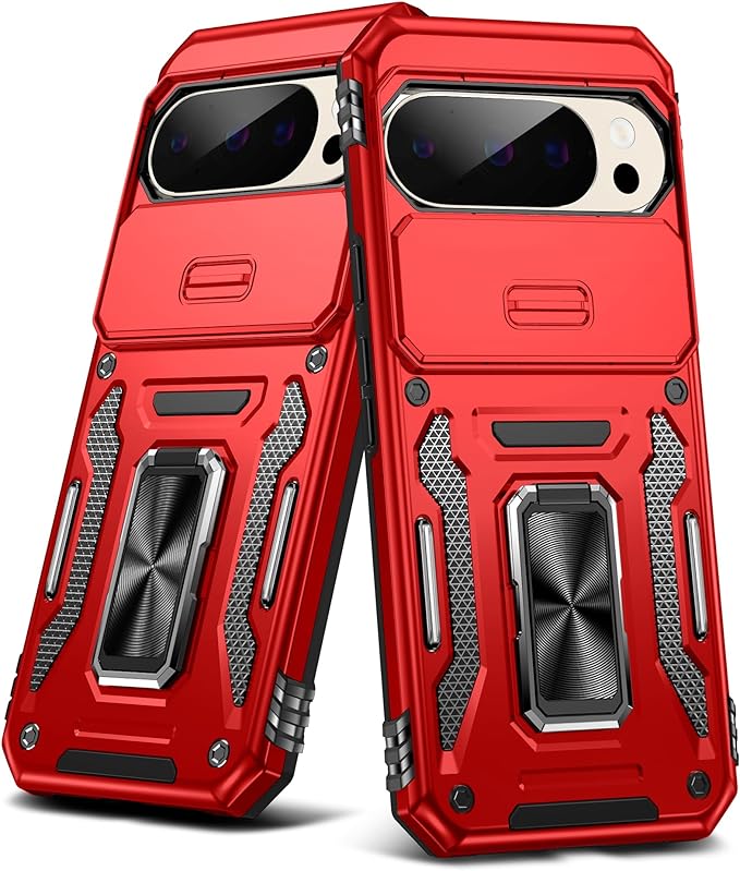 YULNCUZ Google Pixel 10 Pro XL 対応 ケース リング付き スライド式カメラカバー 耐衝撃 スタンド機能 車載ホルダー レンズ保護 ピクセル10 プロ xl 対応 スマホケース PC TPUバンパー 防塵 人気 落下防止 滑り止め 指紋防止 携帯カバー 赤 K358