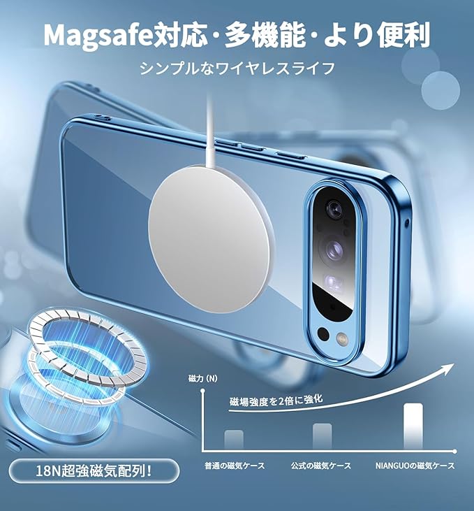 【金属光沢・CDリング・Magsafe対応】NIANGUO Google Pixel 10/10 Pro 用 ケース クリア ストラップホール付き フィット感 黄ばみなし カメラ保護 ソフト ワイヤレス充電対応 マグネット内蔵 耐衝撃 耐久性 メッキ加工 軽量 マグセーフ対応 スマホケース グーグル ピクセル 10・10プロ カバー 6.3インチ(ブルー)