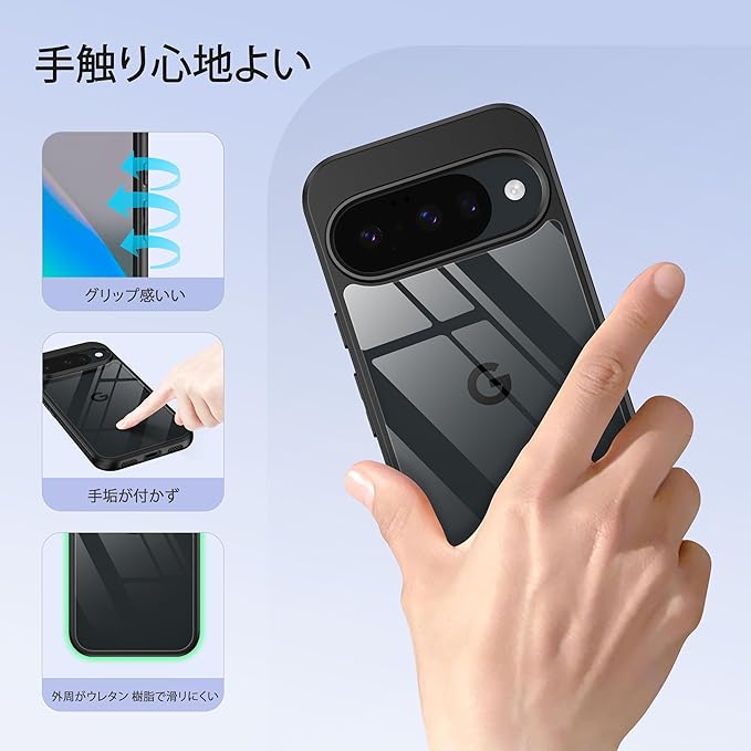 【軽量・フィット感も満点】グーグルピクセル10/10proクリアケースの保護性能を保ちながら、スマートさを損なわないよう、薄さと強度のバランスを取り、手にフィットする程よい厚みで、快適さが保ち、手に持ったときの負担もかかりません、最適な設計で作り出す。滑り止め加工したケースは持ちやすく滑りにくくて取り扱いはしやすいです。装着・脱着も簡単になります。