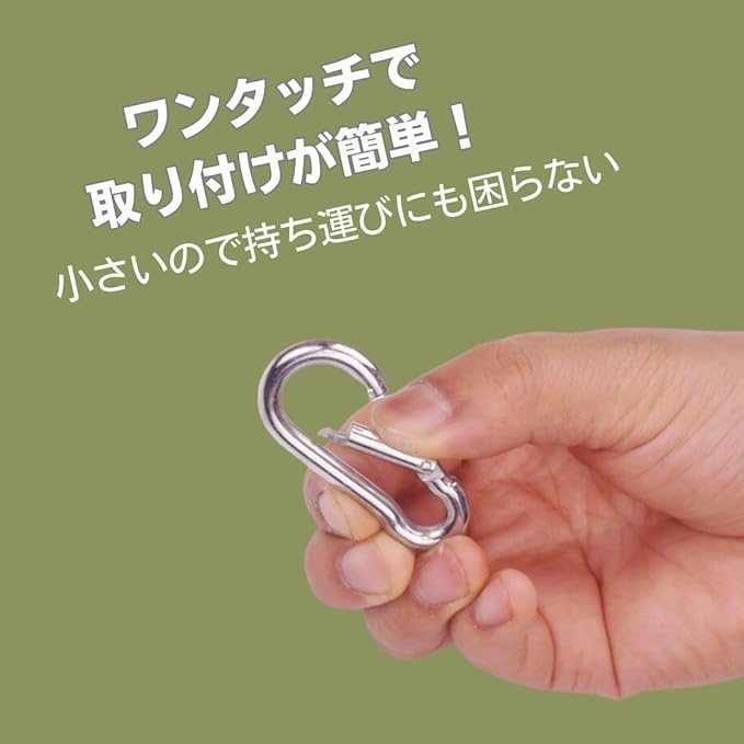 【手軽に使える】操作が簡単なワンタッチ取り付けで、日常生活やアウトドア活動において幅広く利用できる便利なツールです。この製品は、キー、ケトル、バックパック、ロープなど様々なアイテムを手軽に接続するのに最適です。例えば、キャンプ場で重いバックパックをしっかりと固定したり、釣り用具をまとめて持ち運ぶのが非常に便利です。また、遮光ネットや腰道具、ブランコの取り付けにも適しています。