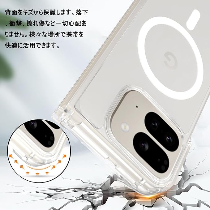 【強防衝撃力・全面保護】耐衝撃にも強く傷もつきにくい構造になっています。全方位からPixel 10 Pro foldを保護してくれます。落下や衝撃や傷から本体をしっかり守ります。それに、背面の縁を高く設計し、Pixel 10 Pro foldの液晶画面をキズから保護します。落下、衝撃、擦れ傷など一切心配ありません。様々な場所で携帯を快適に活用できます。