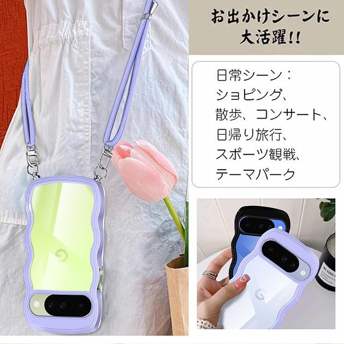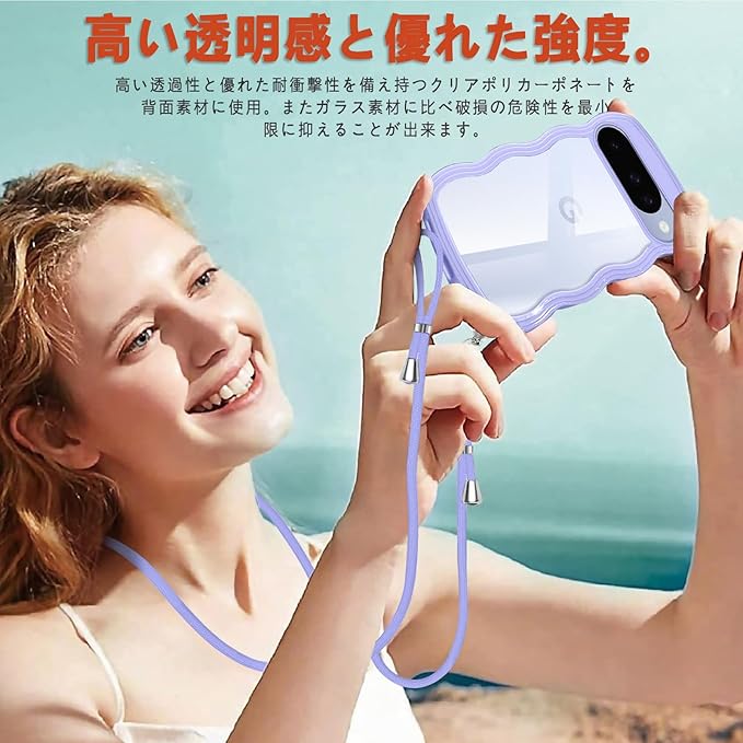 Google Pixel 10 用の ケース ショルダー ストラップ Pixel 10 Pro 用の カバー 波型 ウェーブ 斜めかけ 肩がけ 韓国 ピクセル10 スマホケース パープル