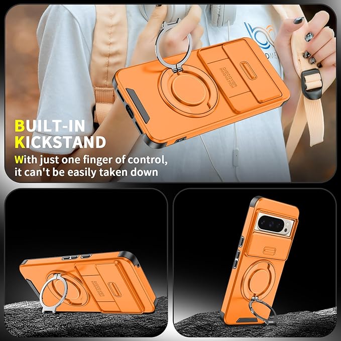 Anlalish携帯ケース 適用する Google Pixel 10 Pro ケース 持っているカメラ保護 耐衝撃 Google Pixel 10 Pro スマホカバー リング人 気 オシャレ車載ホルダー 対応 スライド 保護 カード (オレンジ)