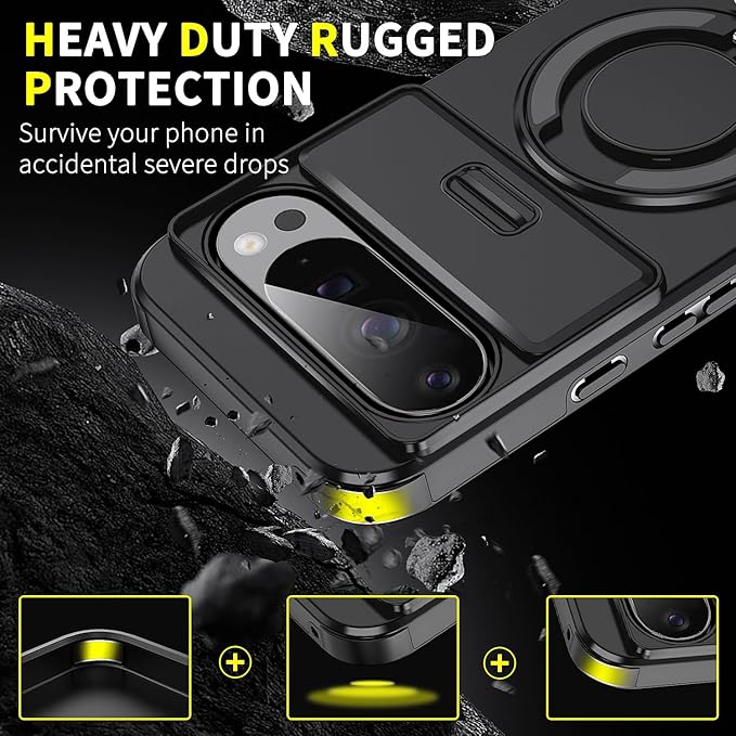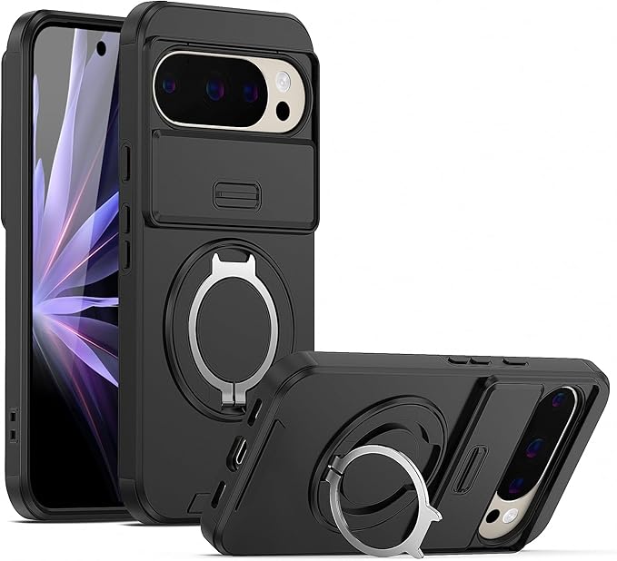 JUMGPYICM Pixel10 Pro XL 対応 ケース 【横縦両立・多機能360度回転スタンド】 リング 耐衝撃 薄型 TPU+PC 車載ホルダー レンズ保護 フィット感 防指紋 おしゃれ ストラップホール付き 落下防止 防塵 グーグル ピクセル10 プロ XL 対応 カバー 6.8インチ ブラック JMJP15-1