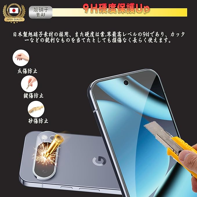 【9H硬度・飛散防止】旭硝子素材製。業界最高レベルの9H硬度、ハードコーティング技術により外部からの衝撃を吸収し、画面へのダメージを最低限まで抑えました。飛散防止加工により万一割れてもガラス破片が飛び散りづらく、とっても安全。