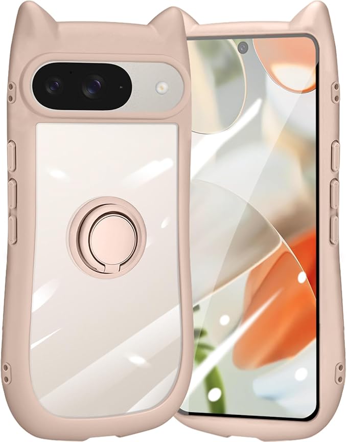 Google Pixel 9/9 Pro 用 ケース クリア カバー 猫耳 リング付き リングホルダ かわいい おしゃれ スタンド付き ストラップホール ピクセル9/9プロ スマホケース 多機能 全面保護 落下防止(ピンク)