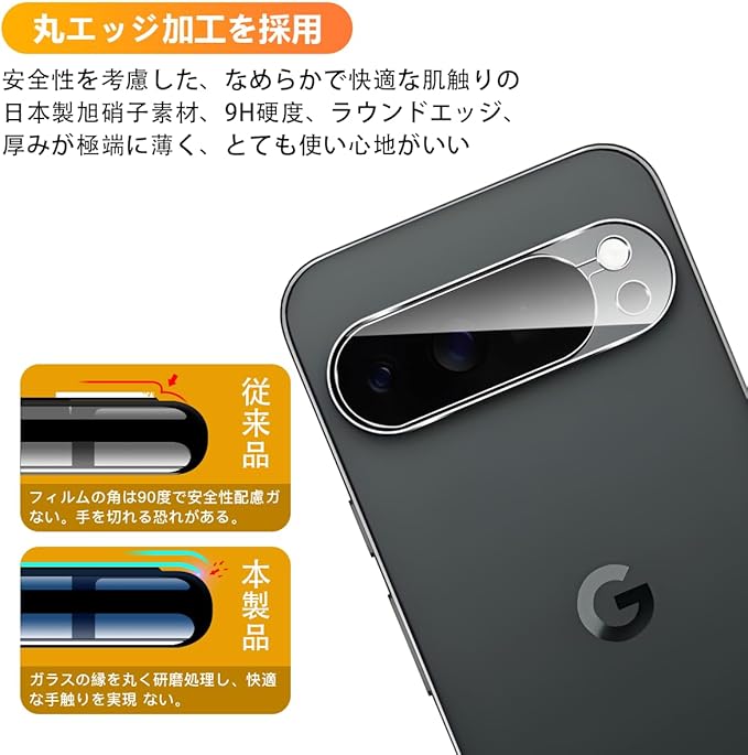 【9H強度&飛散防止】対応 Pixel 10 Pro XL レンズ 強化ガラス 保護フィルムは日本旭硝子素材を採用します。 落下、スクラッチ、衝突、衝撃に高い耐久性があります 衝撃を最小限に抑えてカメラの破損を抑え。カッターなどの鋭利なものを当たってもキズが付きにくくて高い強度を持ち表面硬度9Hが特徴です。特殊な飛散防止設計により、万一割れてしまった際にも飛散することなく、高い安全性を実現します。