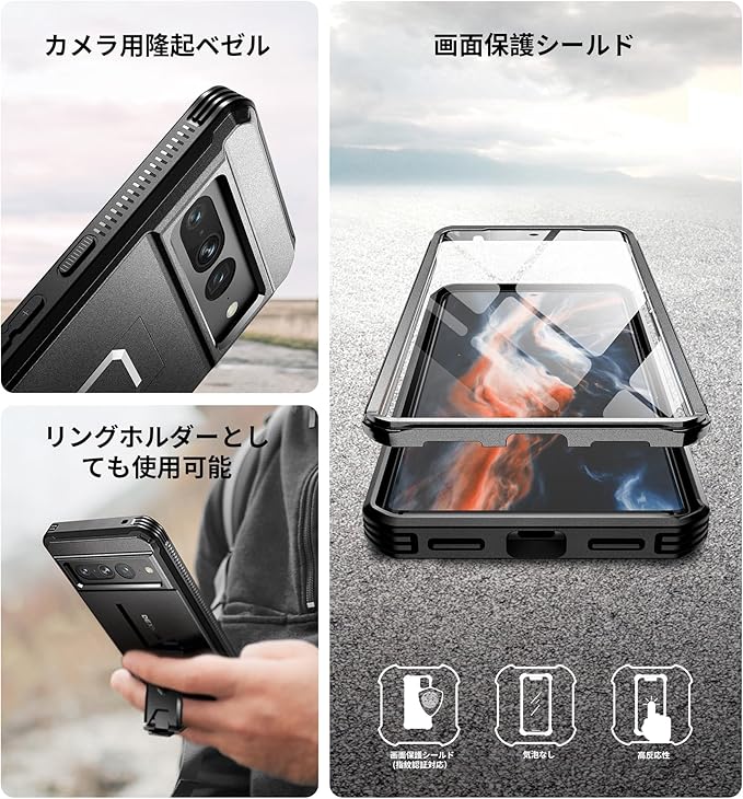 【360 全面防護】 前面・背面を完全にカバーするだけでなく、補強されたコーナーとカメラ・画面周りの盛り上がり加工により、Google Pixel 7 Pro 5Gを落下・割れ・擦り傷からしっかり保護します。