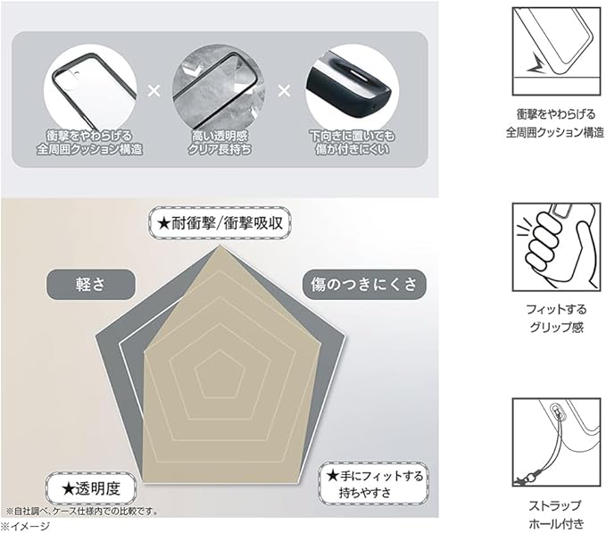 衝撃に強く、フィット感にも優れたハイブリッドケース。 背面は傷に強いポリカーボネート、側面には厚みのあるTPU素材を使用し、安心感のある使い心地を実現しました。 カメラまわりには高さのあるリング設計を採用し、レンズへの接触を防ぎます。 アクセサリーの取り付けに便利なストラップホール付き。