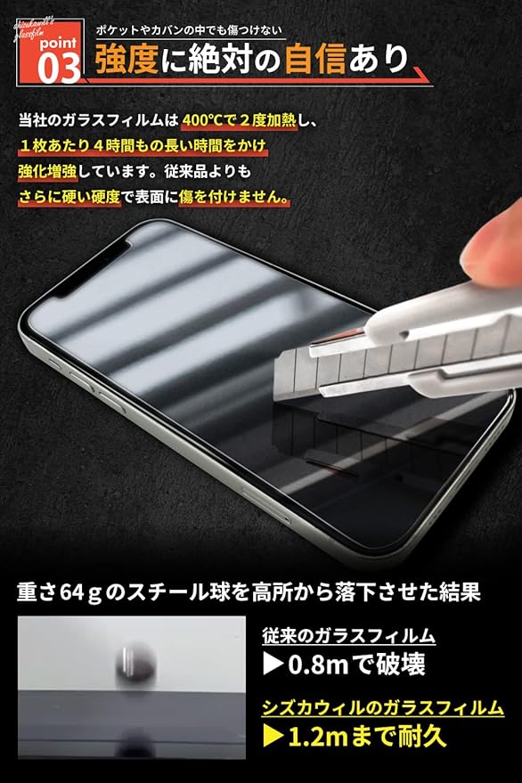 【ナイフでも傷つかない】硬度9H以上でカッターナイフでも傷付かない高強度の強化ガラスフィルム!最先端技術で製造しており、「より割れない」「より浮かない」「角割れしない」ガラスフィルムです