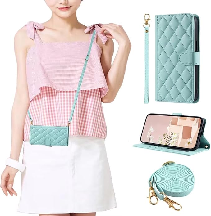 Mldjomid 用のGoogle pixel 9 Pro XL ケース 手帳型 適用googleピクセル9プロxl スマホケース 携帯カバー 適用 ぐーくるぴくせる9プロxl 携帯ケース 肩掛け 用のグーグルピクセル9プロXL スマホケース PUレザー スタンド機能 カード収納 ストラップ付き チェック柄 刺繍 用のGooglePixel9Proxl ケース手帳型 財布型-ライトグリーン