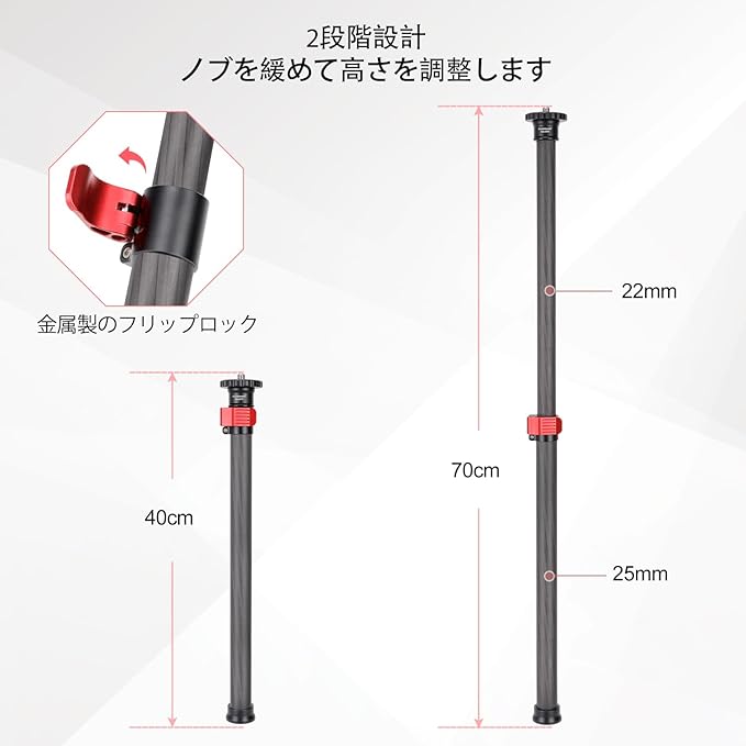 Koolehaoda 70cm延長ポール 三脚センターポール カーボンファイバー製 2段階伸縮三脚延長チューブ 1/4-3/8"ネジ付き 三脚/ジンバル/カメラ対応 最大荷重15KG