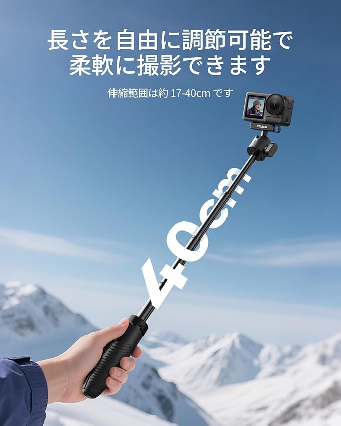 【360 回転可能、長さ調整自由】 この多機能延長ポールは17~40cmの伸縮長さをサポートし、360 回転可能なボールヘッドを搭載。撮影ニーズに応じて角度と長さを自由に調整でき、俯瞰撮影、仰角撮影、水平撮影など多様な角度での創作が可能です。また、カメラの縦位置撮影モードに対応するカメラマウントスロット設計を採用し、ショートビデオ撮影、ライブ配信、Vlog作成など多様な撮影ニーズに対応します。