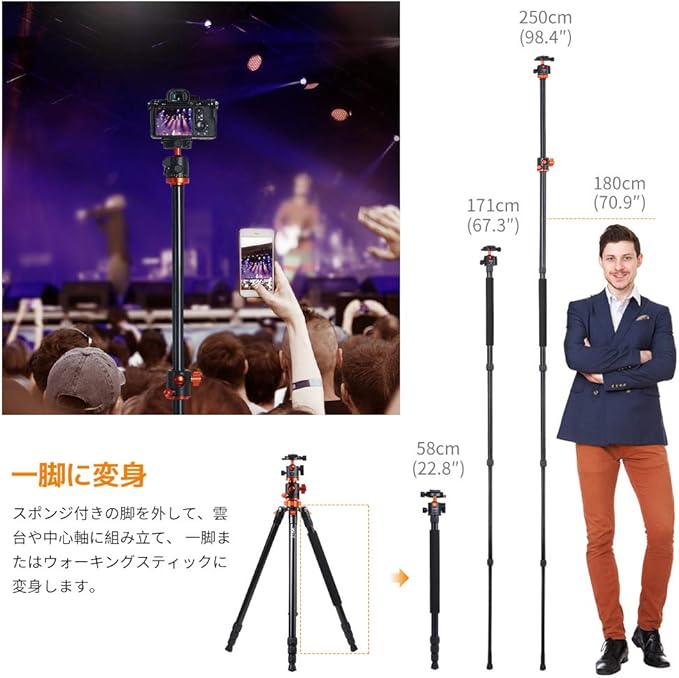 【反転&一脚可変】カメラ三脚の中心軸を倒置して、マクロ撮影が適用です。スポンジ付きの脚を外して雲台と接続すれば、高さ171cmの一脚に変更できます。中心軸と接続すれば、全高は250cmになれ、狭ところや人混みの場所でも使い易いです。また、登山時、トレッキングポールとして、それは汎用性高い一脚三脚です。