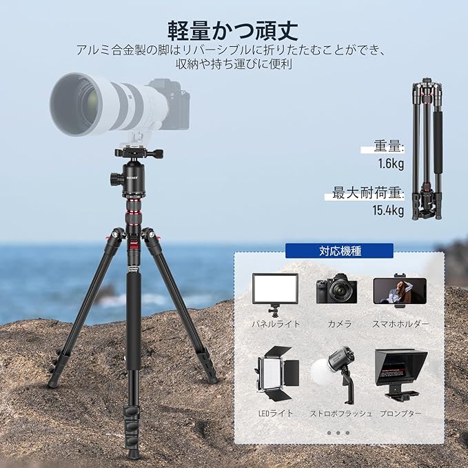 【優れた安定性&携帯性】スマホ三脚スタンドはアルミ合金で作られ、iPhoneとカメラに対応しています。頑丈でありながら軽量な脚部を備え、最大耐荷重は15.4kgで、撮影中に最適な安定性を提供します。トラベル三脚はコンパクトに折りたたむと48cmに収納でき、重量はわずか1.7kgで、付属バッグに入れて簡単に持ち運びます。クリーニングクロスも付属しており、最高の状態を保証し、外出先でも美しい写真を撮ります。