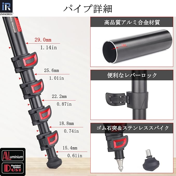 INNOREL カメラ用 一脚 アルミ製 170CM 12KG耐荷重 5セクション 伸縮可能 コンパクト便利 軽量 旅行用 U325A