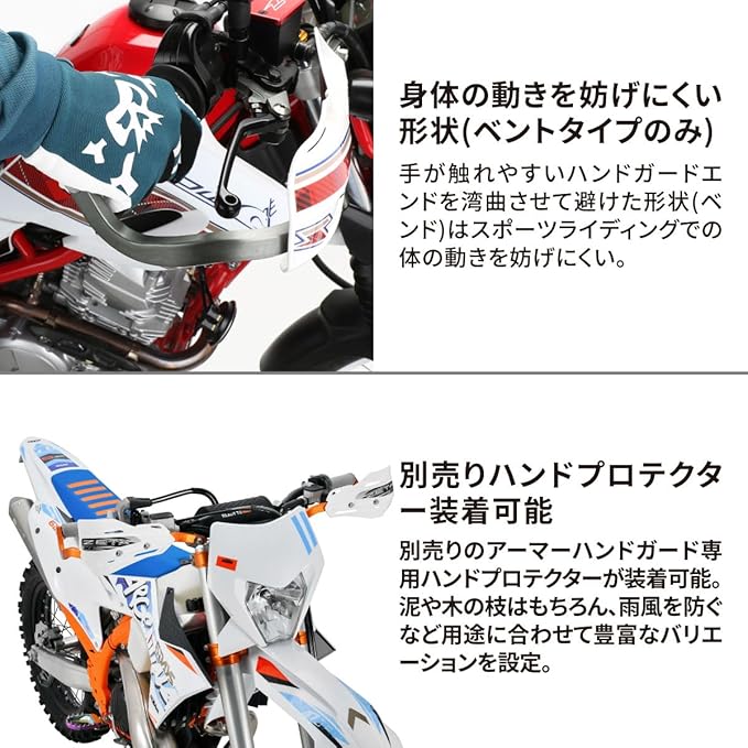 手が触れやすいハンドガードエンドを湾曲させて避けた形状(ベンド)は、スポーツライディングでの体の動きを妨げにくい。