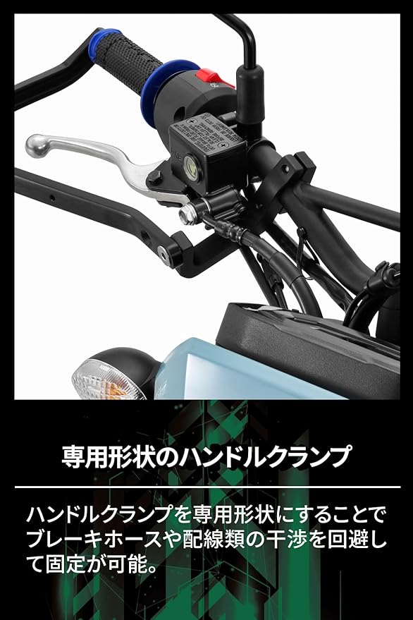 ハンドルクランプを専用形状にすることで、ブレーキホースや配線類の干渉を回避して固定が可能。