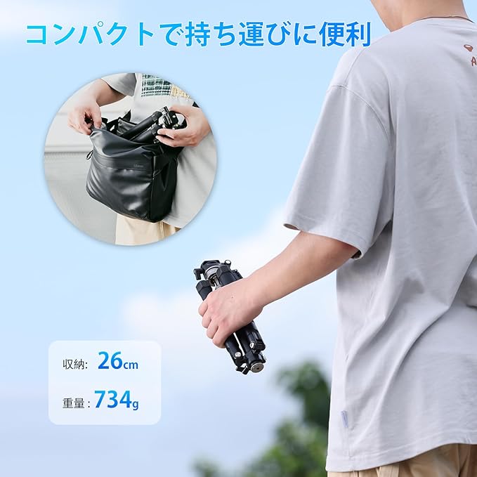 【ポータブル三脚&1台2役】MT-63三脚は航空用アルミ製合金製で、純粋な機械的CNC機械加工とハードアルマイトを採用し、安定性と耐久性を備えています。脚を逆向きに折り畳む可能なデザインで、収納後わずか26.5cm、超コンパクトで持ち運びにも便利です。さらに、センターボールは簡単に取り外しでき、自撮り棒として使用可能です。