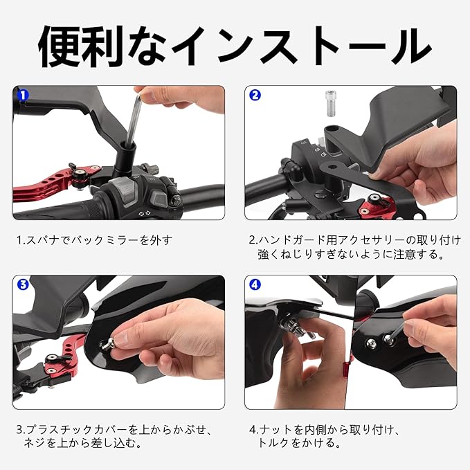 【安全性の向上】高速走行時でも飛び石避けや木の枝、泥その他の障害物から身を守ることができるバイク用ナックルガードです。ライダーの指の快適性が向上します