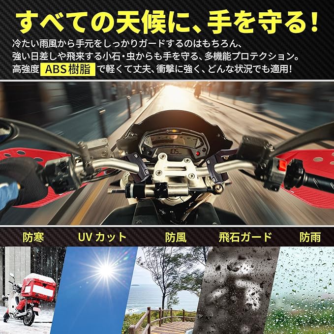 【どんな天候にも応えるハンドガード】サイクリング中の手が受ける雨、寒、風、紫外線、飛散する砂利にまだ悩まされていませんか?当社のハンドガードは、まさにこの課題を解決する「五重の守り」を実現します。採用素材には耐水性と防風性を兼ね備えた高機能素材で、突然の雨や冷たい風から手を守ります。さらに、紫外線カット加工により、長時間の日差しから肌を保護します。一つの装備で、季節や天候を問わず、楽々なサイクリングを楽しみ。
