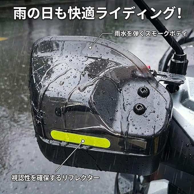 雨除け・防護力:雨水や泥はねの侵入を抑えつつ、飛び石・小枝・虫などの飛来物から手を守るオールウェザー設計。悪天候や荒れた路面でも視認性と安全性を確保できます