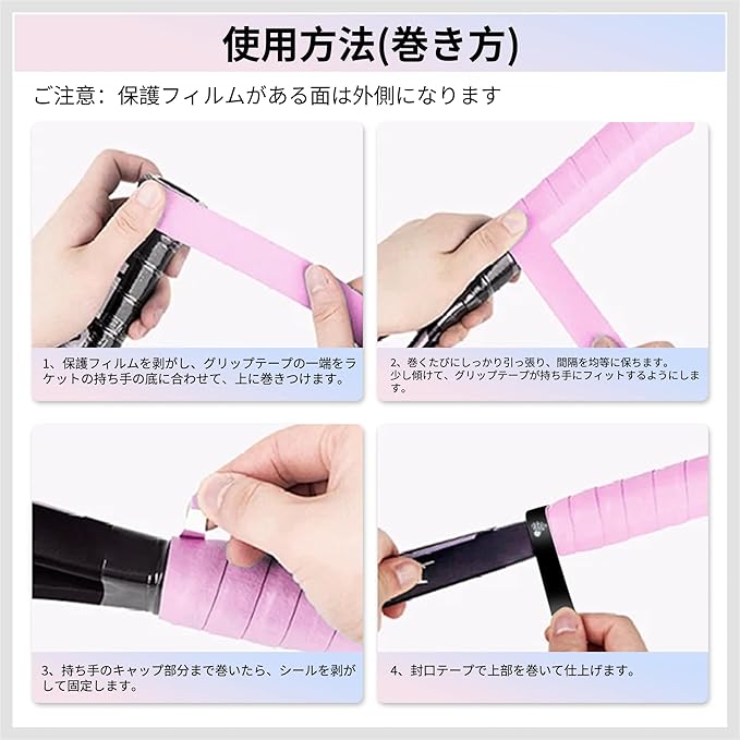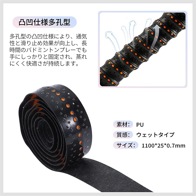 テニス、バドミントンなどのラケットスポーツに適した多目的アクセサリーで、オーバーグリップや交換テープとしても使用できます。さまざまなスポーツや機器のニーズに柔軟に対応します。