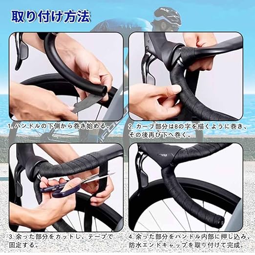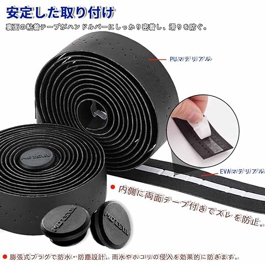 【簡単取付、しっかりフィット】裏面のテーパーカットデザインにより、巻きやすく、バーテープが自然にフィットします。エンドキャップと専用エンドテープが付属し、端部を美しく仕上げられるので、簡単に取り付けが完了します。