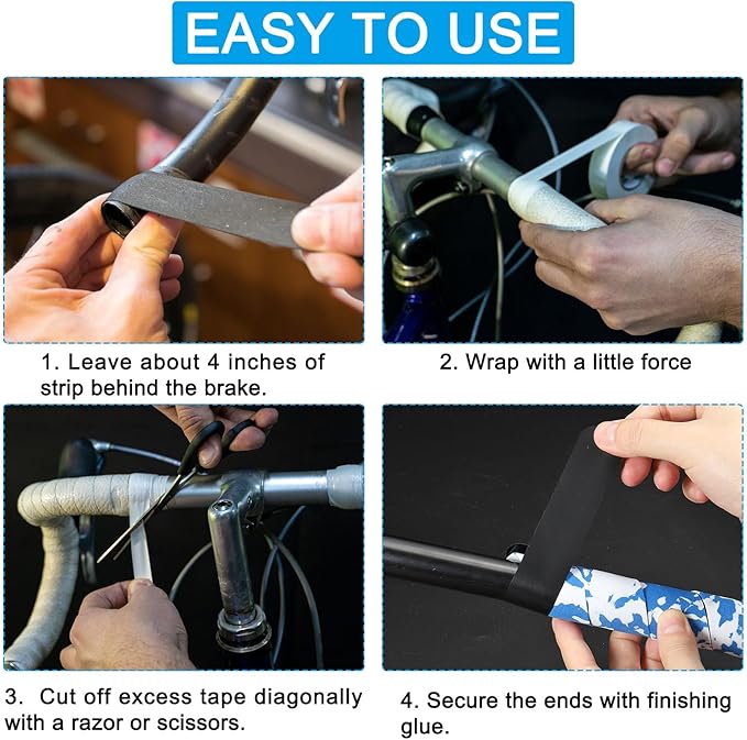 取り扱い方法:1. ブレーキの後ろに約4"のストリップを残します。2. ハンドルバーの下部から始め、エッジ付近の粘着テープに沿って時計回りに巻きます。3. 余分なテープを斜めにカッターやはさみで切り取ります。