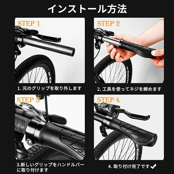 【 取付簡単・幅広い用途】自転車のハンドルバーにハンドルを取り付け、六角レンチでボルトを締め、このハンドルは折り畳み自転車、クロスカントリー自転車、マウンテンバイク、ロードバイク。耐久性 滑り止め 快適 衝撃吸収 握りやすい など様々な優れた特性を有する、快適で安全な自転車乗り体験を提供する理想的なアクセサリーです。